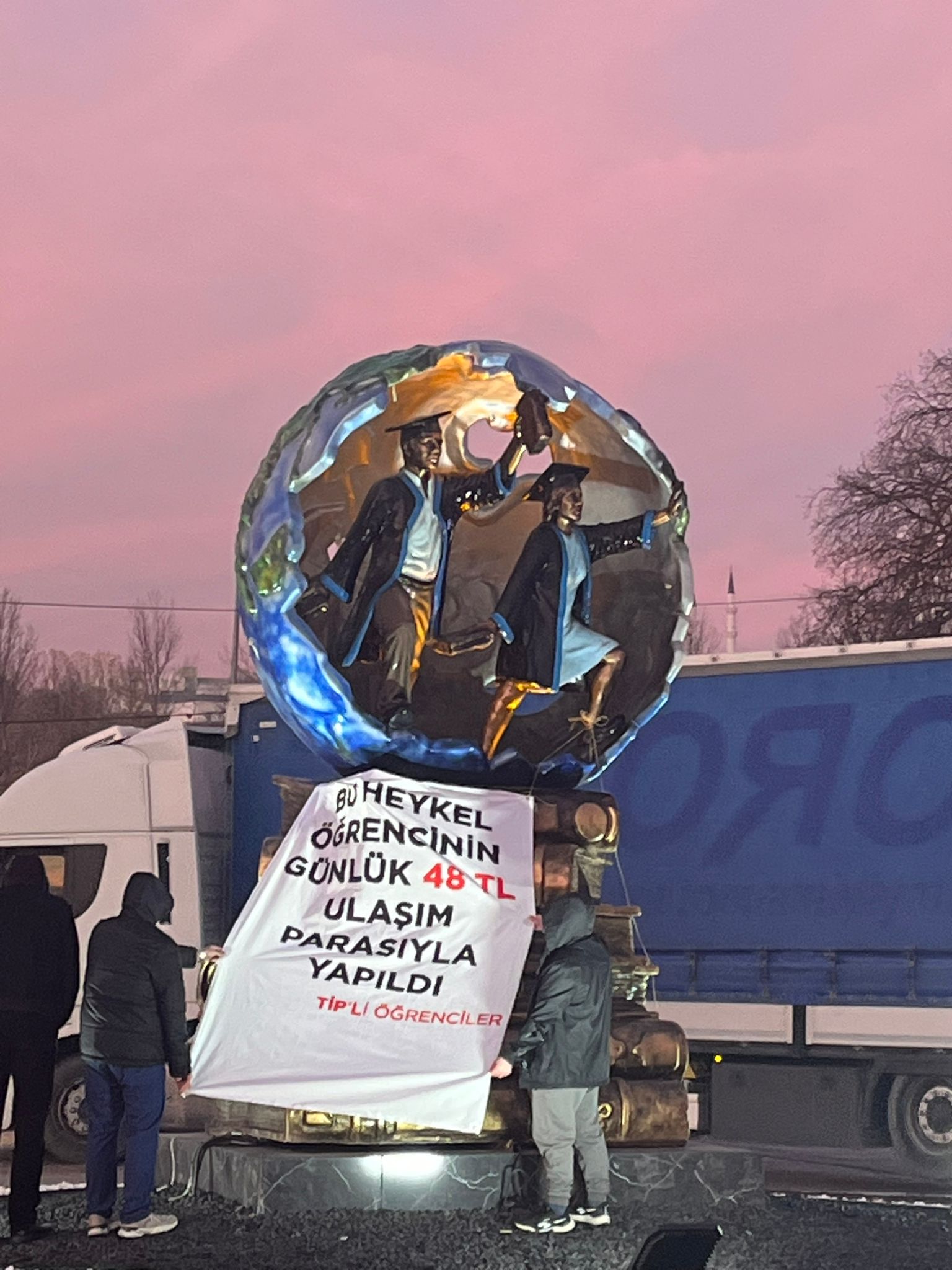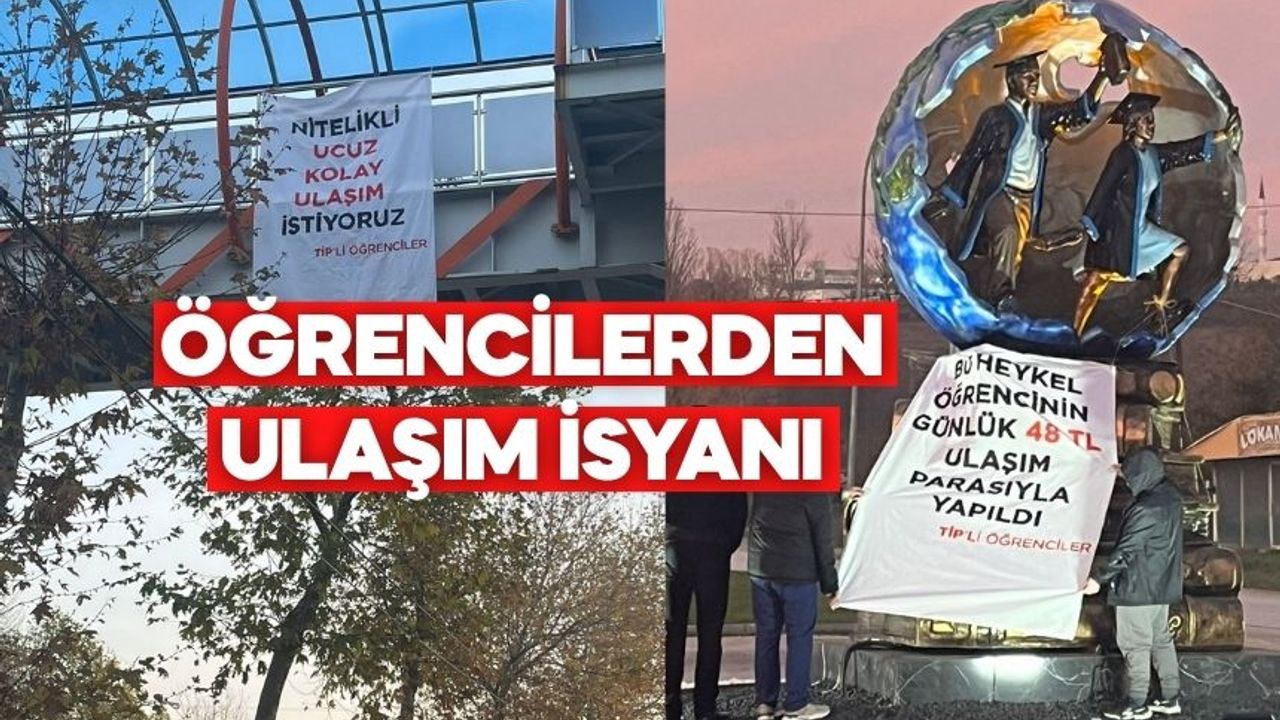 Bir diğer eylem ise üniversite kavşağında gerçekleştirildi. Kavşakta yer alan “öğrencileri temsil eden” heykelin önüne öğrenciler tarafından yeni bir pankart asıldı. Pankartta, “Bu heykel öğrencinin günlük 48 TL ulaşım parasıyla yapıldı” ifadeleri dikkat çekti.