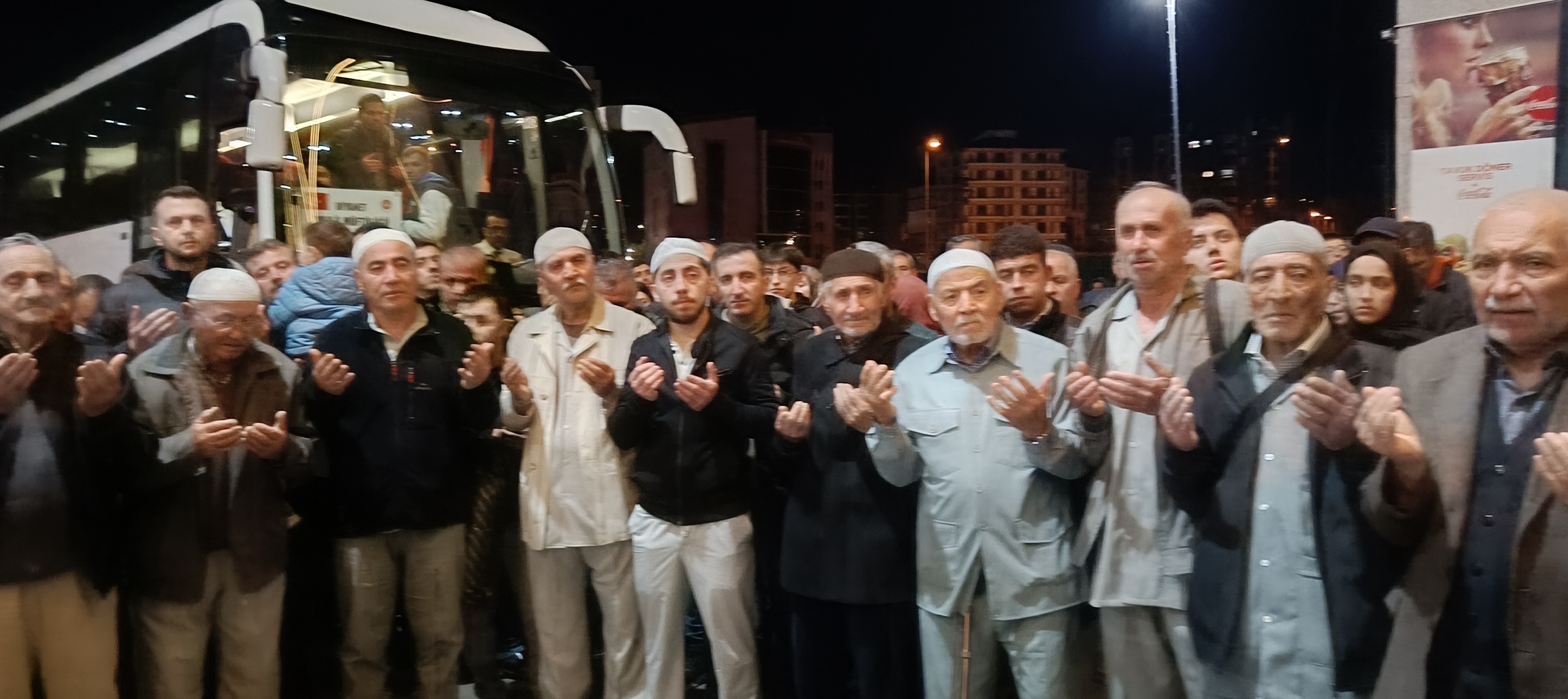 Uğurlama töreninde duygusal anlar yaşandı. Umreye gidenler ve yakınları helalleşip sarılırken, tekbirler ve salavatlar eşliğinde gözyaşları döküldü.