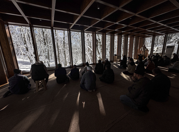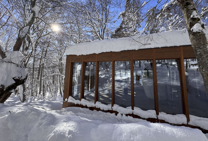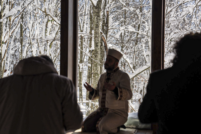 Bolu merkeze bağlı Elmalık Köyü’nde, 16. yüzyılda yaşamış mutasavvıf Hayreddin-i Tokadi Hazretleri’nin türbesinin de bulunduğu alanda yer alan mescitte, kar manzaraları eşliğinde namaz kılınıyor. Doğal ortama uygun olarak ahşaptan inşa edilen mescidi, beton duvarlar yerine ahşap sütunlar ve camlar ayakta tutuyor. Son yıllardaki tarihi kar yağışlarından birini geçtiğimiz günlerde alan Bolu’da bazı vatandaşlar, Hayreddin-i Tokadi Mescidi’ne gelerek Cuma namazını bu manzara eşliğinde kıldı.