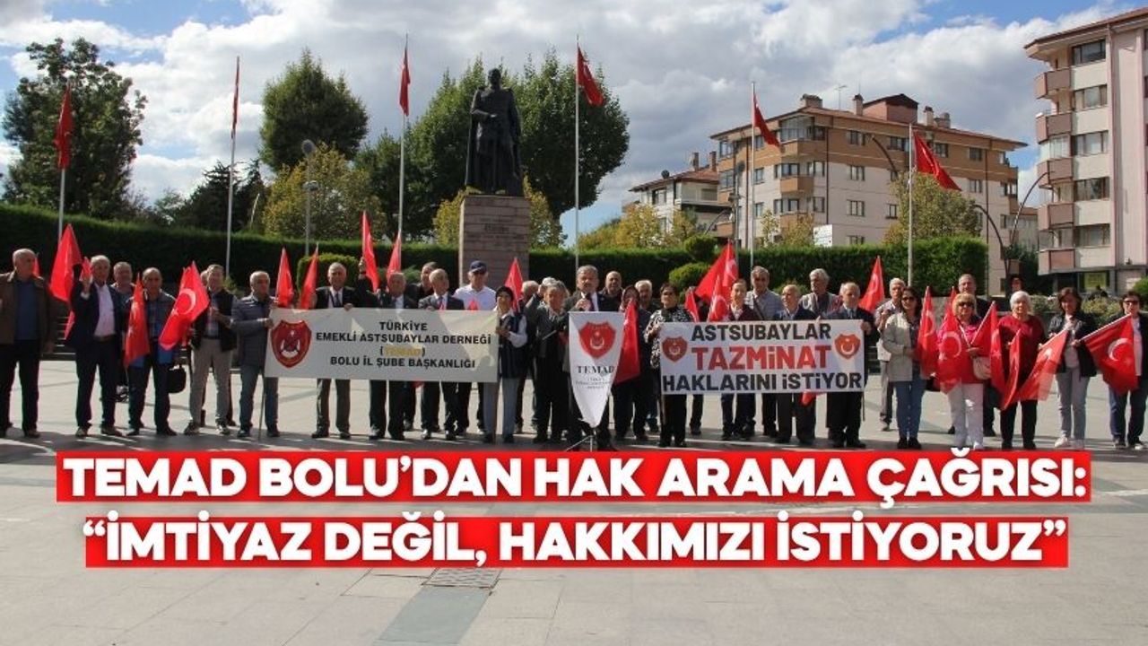 Türkiye Emekli Astsubaylar Derneği (TEMAD) Bolu İl Başkanlığı, emekli ve görevdeki astsubayların özlük ve tazminat haklarına ilişkin taleplerini duyurmak amacıyla 4 Ekim Cumartesi günü Anıtpark’ta bir basın açıklaması gerçekleştirdi. Dernek üyeleri ve vatandaşların katıldığı programda açıklamayı TEMAD Bolu İl Başkanı Ramazan Musluk yaptı.
