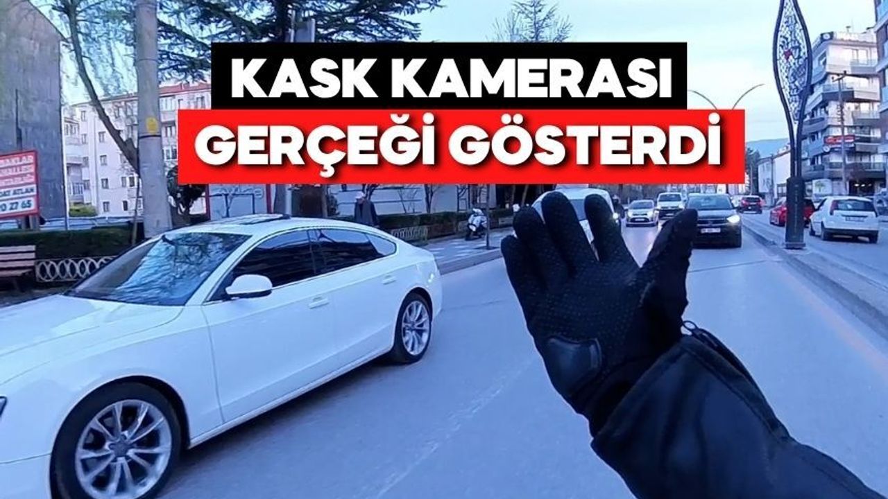 Bolu'da aniden yola çıkarak motosikletliyi tehlikeye atan ve ardından "Hatalı sollama yaptın" diyerek polise şikayette bulunan otomobil sürücüsünün haksız olduğu, kask kamerası görüntüleriyle ortaya çıktı. Görüntüleri izleyen sürücü hatasını kabul etmek zorunda kaldı.