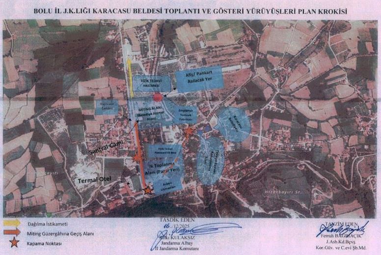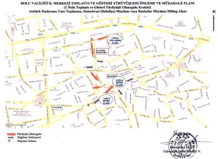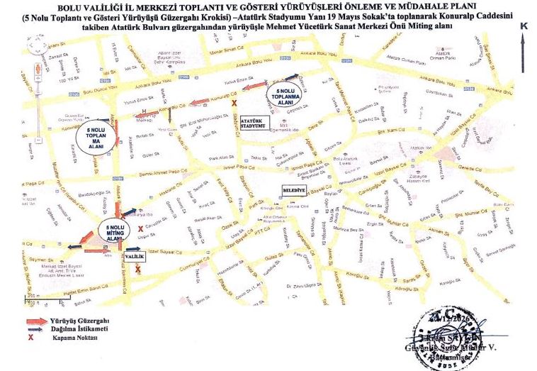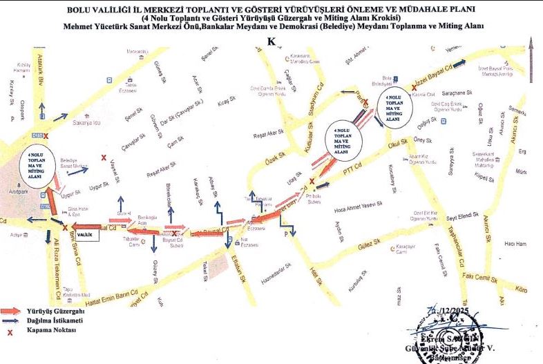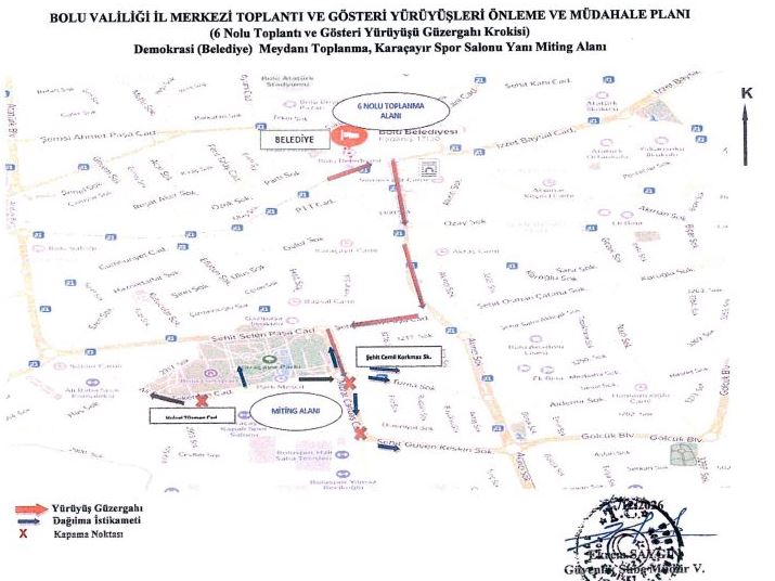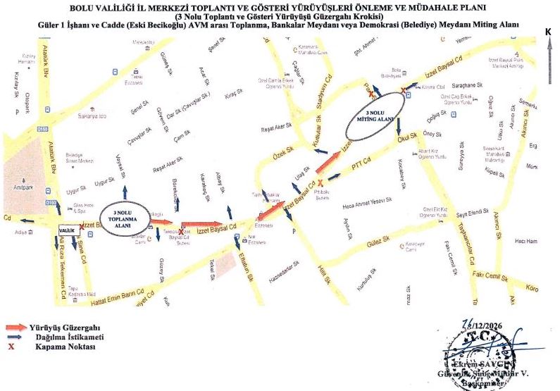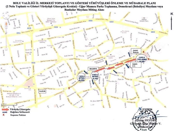 Mitinglerin Belediye Hizmet Alanı’nda yapılabileceği açıklanırken, dağılmanın Kaplıca Caddesi ve Bolu–Kıbrıscık yolu üzerinden Bolu istikametine doğru sağlanacağı bildirildi.