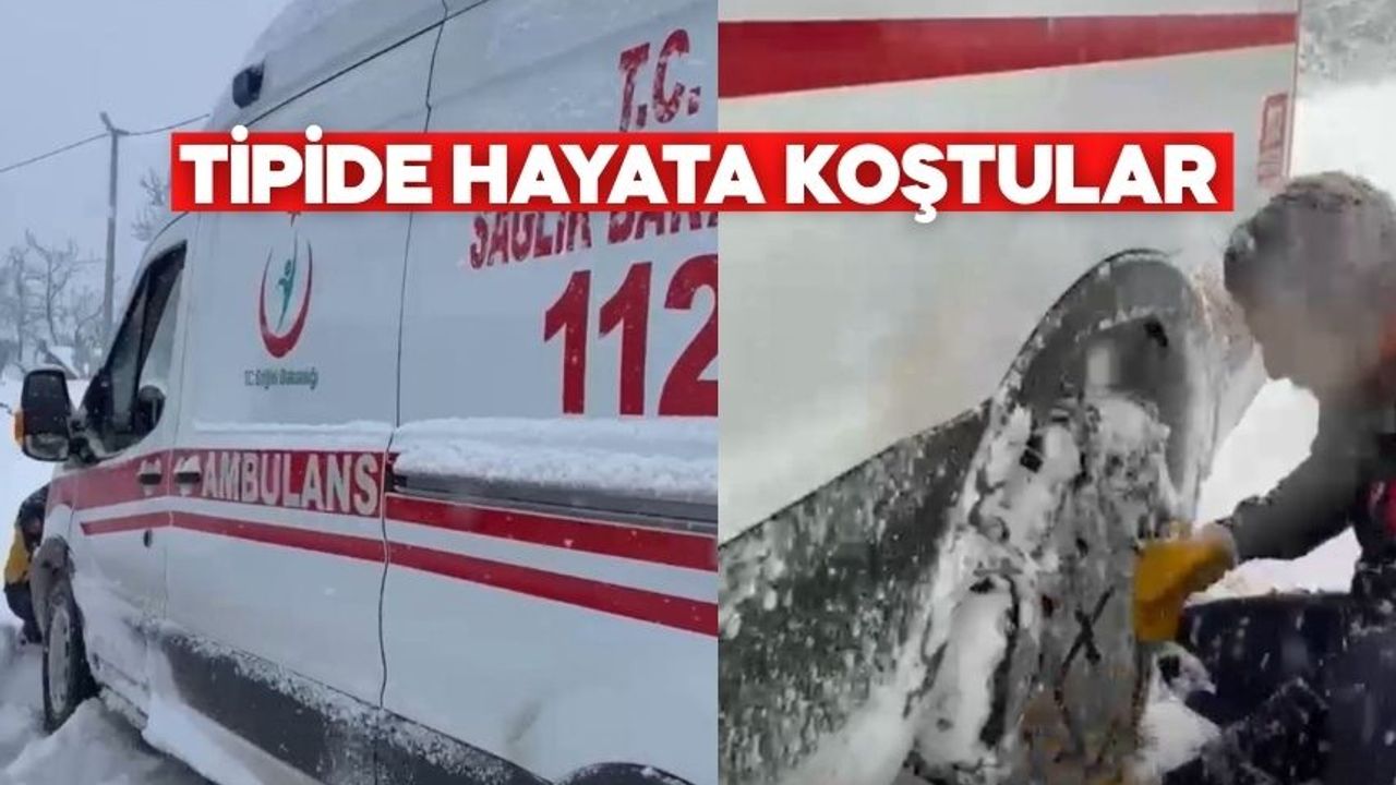 Bir süre sonra kara saplanarak yolda kalan ambulanstaki sağlık personeli, dondurucu soğuğa ve yoğun yağışa rağmen araçtan inerek çalışma başlattı. Lastiklere zincir takarak aracı saplandığı yerden kurtaran ekipler, zorlu mücadelenin ardından yola devam ederek hastaya ulaştı.