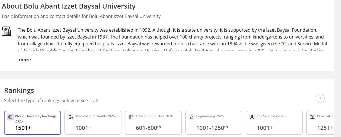 THE 2026 verilerine göre Bolu Abant İzzet Baysal Üniversitesi, genel dünya sıralamasında 1501+ bandında yer aldı. Üniversite, alan bazlı değerlendirmede ise farklı performanslar sergiledi.