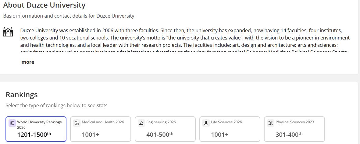 THE 2026 sıralamasında yer alan Düzce Üniversitesi, BAİBÜ ile benzer bölgesel koşullara sahip olmasına rağmen, bazı alanlarda daha üst sıralarda konumlandı.