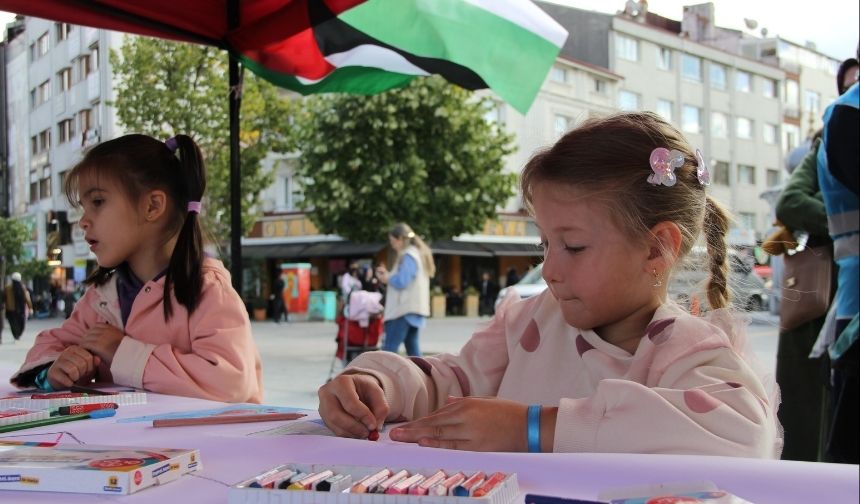 Çocuklar ve vatandaşlar, Filistinli çocuklara yönelik zulme karşı duyarlılıklarını tuvallerine yaptıkları resimlerle dile getirdi. Bolu’da çizilen eserler, 80 ilden gelen tuvallerle birleşerek 15 kilometre uzunluğunda bir farkındalık tuvali haline getirilecek.