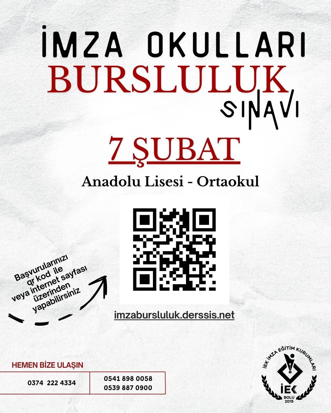 Bolu’da faaliyet gösteren İmza Okulları tarafından düzenlenecek bursluluk sınavının tarihi açıklandı. Ortaokul ve Anadolu Lisesi düzeyindeki öğrencilerin katılımına açık olan bursluluk sınavı, 7 Şubat tarihinde gerçekleştirilecek.