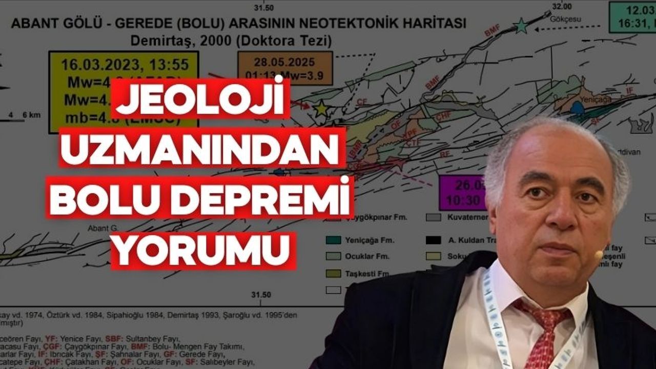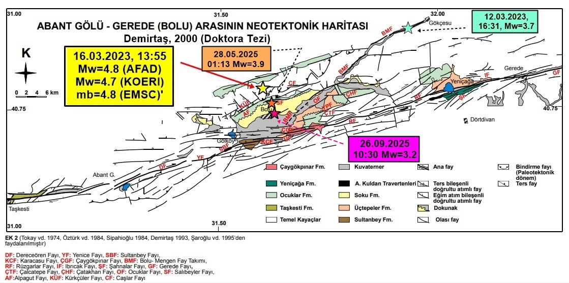 Demirtaş’ın paylaşımında, Abant Gölü–Gerede arasındaki fay zonunu gösteren neotektonik harita da yer aldı. Haritada bölgedeki ana faylar, tali faylar ve geçmişte meydana gelen depremlerin büyüklükleri işaretlendi.