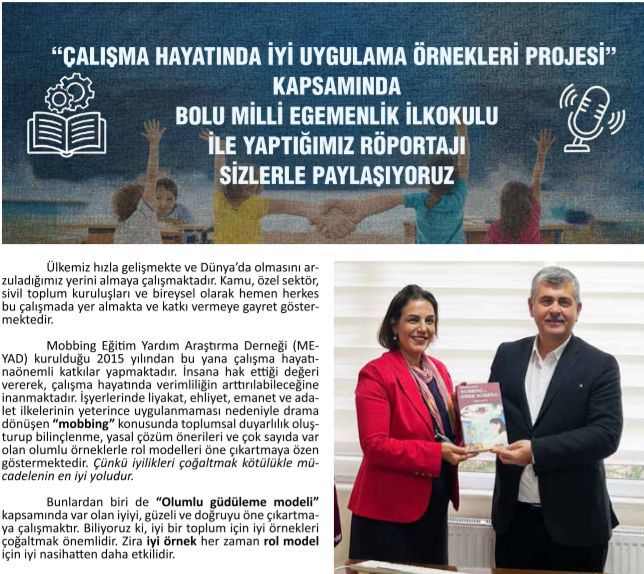 Merkezi Ankara’da bulunan Mobbing Eğitim Yardım Araştırma Derneği (MEYAD), “İyi Uygulama Örnekleri Projesi” kapsamında Bolu Milli Egemenlik İlkokulu’nu ziyaret ederek kapsamlı bir röportaj gerçekleştirdi. Ziyarette, okulda uygulanan insan odaklı yönetim anlayışı ve başarılı organizasyonlar yerinde incelendi.