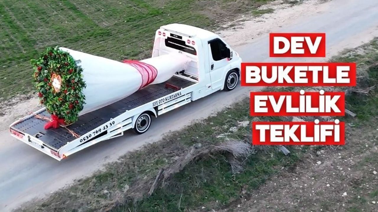 Uzun süredir evlilik planı yapan Efe, oto kurtarıcının taşıma platformuna demir iskelet yerleştirip tüller ve çiçeklerle süsleyerek büyük bir buket oluşturdu. Buketin üzerine LED ışıklarla "Benimle evlenir misin?" yazısı yerleştirildi.
