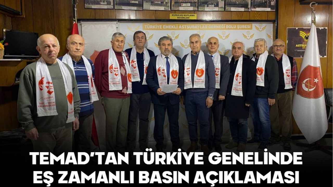 Türkiye Astsubaylar Derneği Genel Merkezi koordinesinde, ülke genelinde faaliyet gösteren 100 şubenin katılımıyla eş zamanlı basın açıklaması gerçekleştirildi. TEMAD Bolu İl Şube Başkanlığı da saat 14.00’te dernek binasında basın mensuplarına açıklamalarda bulundu.