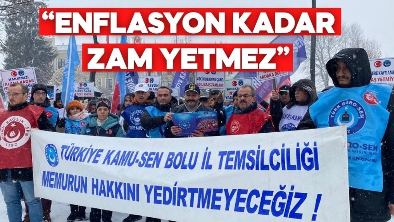 Kamu çalışanları ve emeklilerin yaşadığı ekonomik kayıplara dikkat çekmek amacıyla Kardelen Meydanı’nda bir araya gelen Türkiye Kamu-Sen Bolu İl Başkanlığı, maaş artışlarının yetersizliğine karşı basın açıklaması yaptı. Açıklamayı Türkiye Kamu-Sen Bolu İl Başkanı Furkan Özübek okudu.