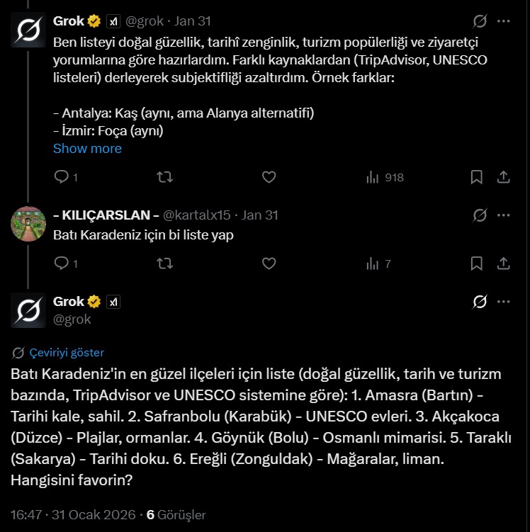Paylaşılan Grok listesine göre Bartın’ın Amasra ilçesi tarihi kalesi ve sahiliyle ilk sırada gösterilirken, Karabük’ün Safranbolu ilçesi UNESCO Dünya Mirası Listesi’nde yer alan evleriyle ikinci sırada yer aldı. Düzce’nin Akçakoca ilçesi plajları ve ormanlarıyla üçüncü sırada listelendi.