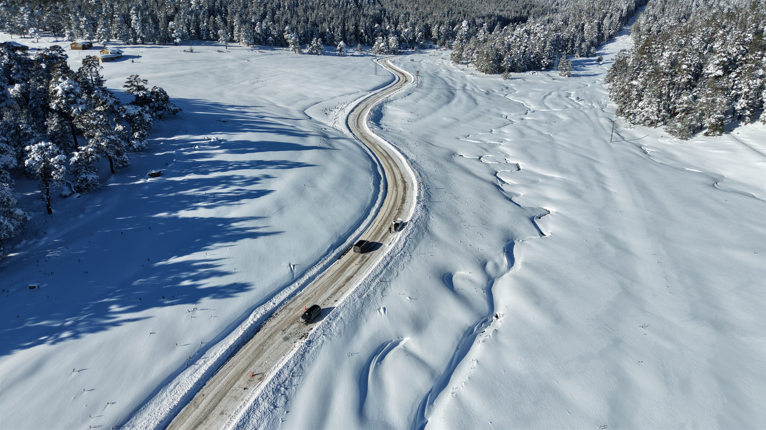 Bolu'nun güneydoğusunda Kartalkaya yolu üzerinde bulunan 14 köy yaylasından oluşan Sarıalan Yaylası, kış mevsiminin gelmesiyle birlikte beyaz örtüyle kaplandı. Yaylada oluşan kış manzarası havadan görüntülendi.