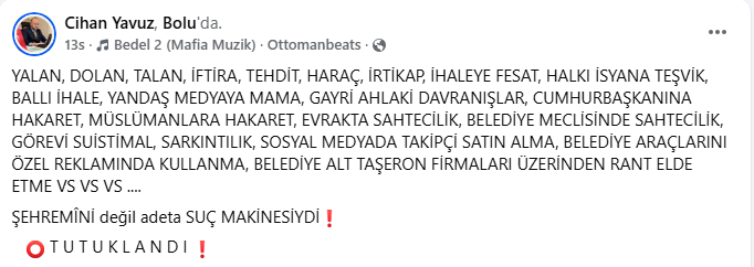 Paylaşımda ayrıca, soruşturmada kamuoyuna yansımadığı bilinen birçok ağır suçlama da sıralandı. “Müslümanlara hakaret, evrakta sahtecilik, belediye meclisinde sahtecilik, görevi suistimal, sarkıntılık, sosyal medyada takipçi satın alma, belediye araçlarını özel reklamda kullanma, alt taşeron firmalar üzerinden rant elde etme” gibi iddialar kamuoyuna sunuldu.