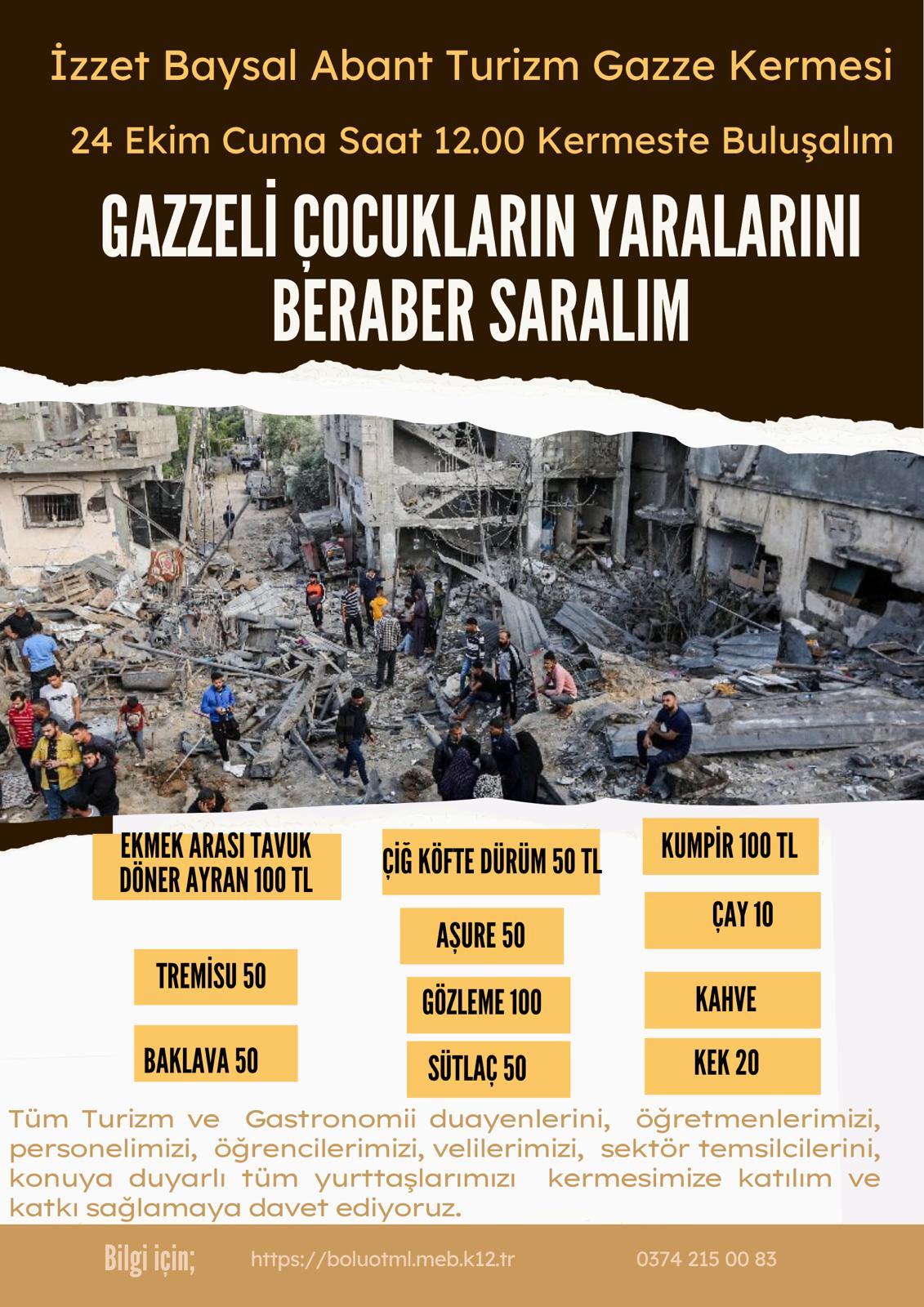 Bolu’da öğrenciler, Gazze’deki çocuklara umut olmak için kolları sıvadı. İzzet Baysal Abant Turizm Mesleki ve Teknik Anadolu Lisesi, 24 Ekim Cuma günü saat 12.00’de “Gazzeli Çocukların Yaralarını Beraber Saralım” temalı kermes düzenleyecek. Gelirin tamamı Gazze’deki mağdur çocuklara gönderilecek.